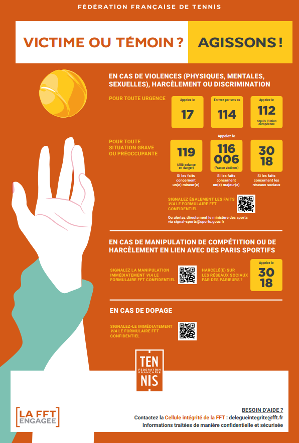 La Fédération Française de Tennis (FFT) a fait de la protection physique et mentale des pratiquants une priorité nationale : prévenir, signaler et accompagner face à toute forme de violence sexuelle, physique, verbale ou psychologique.